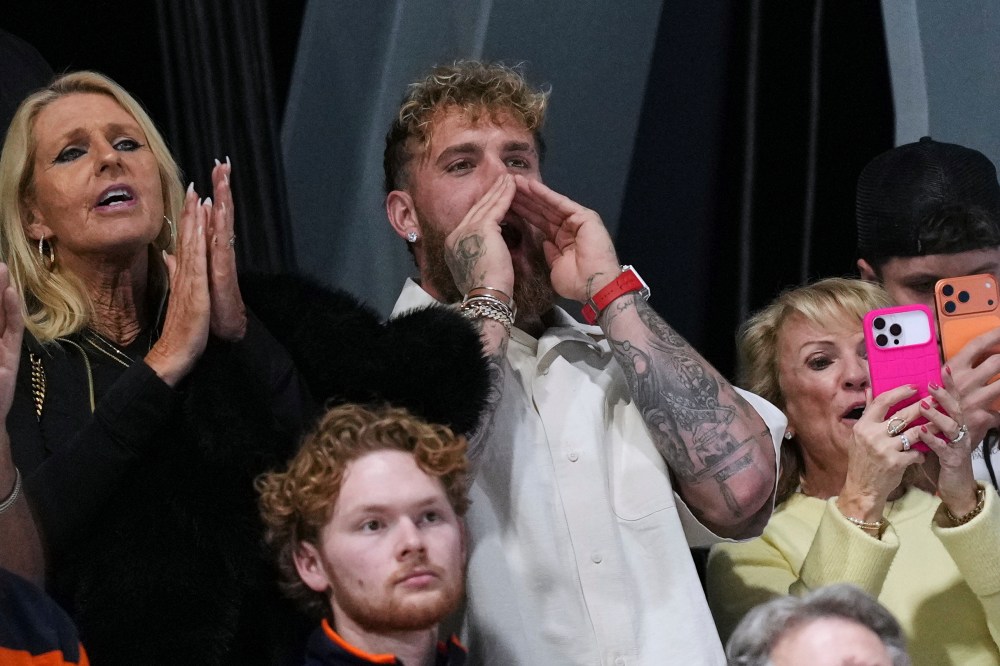 Jake Paul of the U.S. screams as his fiancée Jutta Leerdam of the Netherlands celebrates with her silver medal on the podium of the women's 500 meters speedskating race at the 2026 Winter Olympics, in Milan, Italy, Sunday, Feb. 15, 2026. (AP Photo/Antonio Calanni)