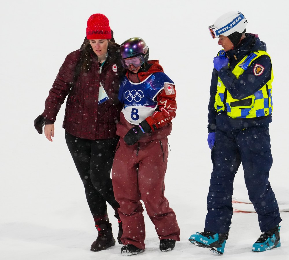 Elizabeth Hosking from Longueuil, Que., is helped out of the halfpipe after crashing on her final run in the women's snowboard halfpipe at the Milano Cortina 2026 Winter Olympic Games in Livigno, Italy on Thursday, Feb. 12, 2026. THE CANADIAN PRESS/Sean Kilpatrick