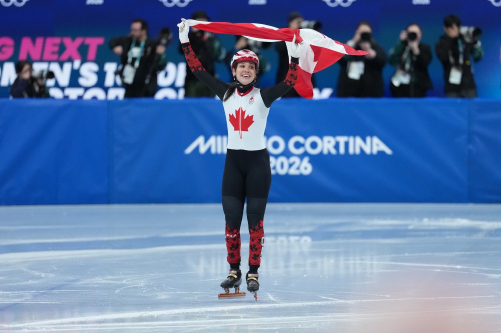 Canada's Courtney Sarault celebrates winning the silver medal in the women's 1,000 metre short track speedskating finals at the 2026 Winter Olympics, in Milan, on Monday, February 16, 2026. THE CANADIAN PRESS/Darryl Dyck