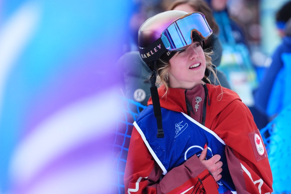 Canada's Laurie Blouin reacts after her third run as she competes in women's snowboard slopestyle at the Milano Cortina 2026 Winter Olympic Games in Livigno, Italy, Wednesday, Feb. 18, 2026. THE CANADIAN PRESS/Sean Kilpatrick