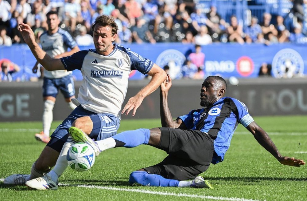 Nashville SC's Jack Maher, left, defends against CF Montreal's Prince Owusu during first half MLS soccer action in Montreal, Saturday, Oct. 4, 2025. THE CANADIAN PRESS/Graham Hughes