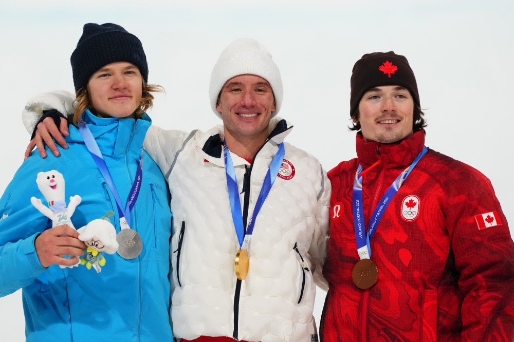 Canada's Brendan Mackay, right, poses on the podium after winning the bronze medal in the men's freeski halfpipe, with silver medallist Estonia's Henry Sildaru, left, and gold medallist USA's Alex Ferreira, at the Milano Cortina 2026 Winter Olympic Games in Livigno, Italy on Friday, Feb. 20, 2026. THE CANADIAN PRESS/Sean Kilpatrick