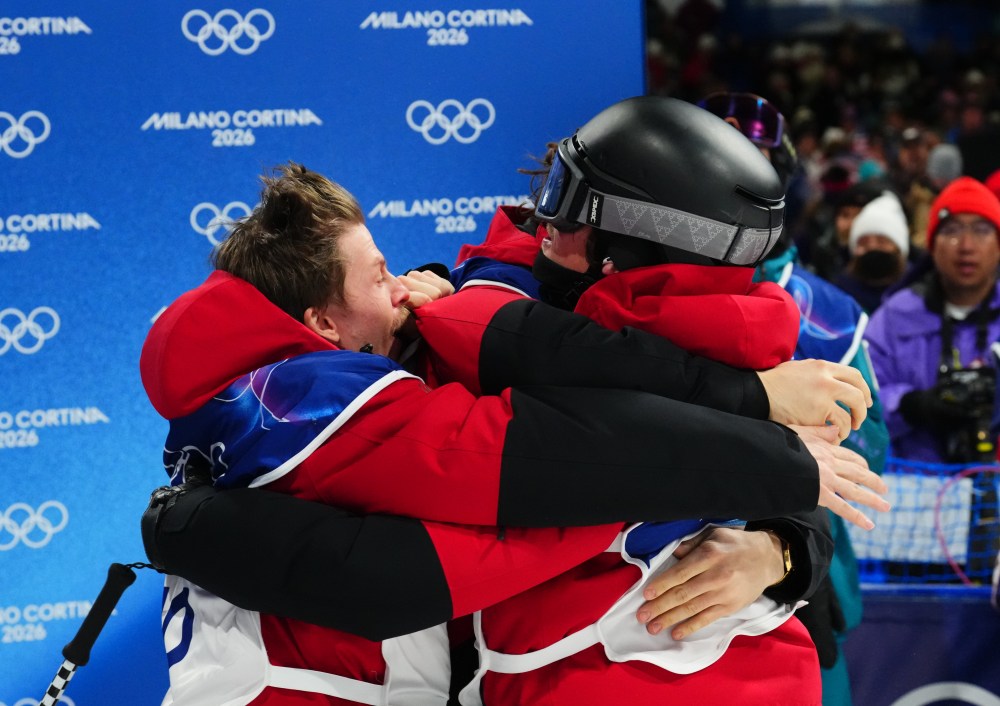 Canada's Brendan Mackay (4) hugs his teammates after winning the bronze medal in the men's freeski halfpipe final at the Milano Cortina 2026 Winter Olympic Games in Livigno, Italy on Friday, Feb. 20, 2026. THE CANADIAN PRESS/Sean Kilpatrick