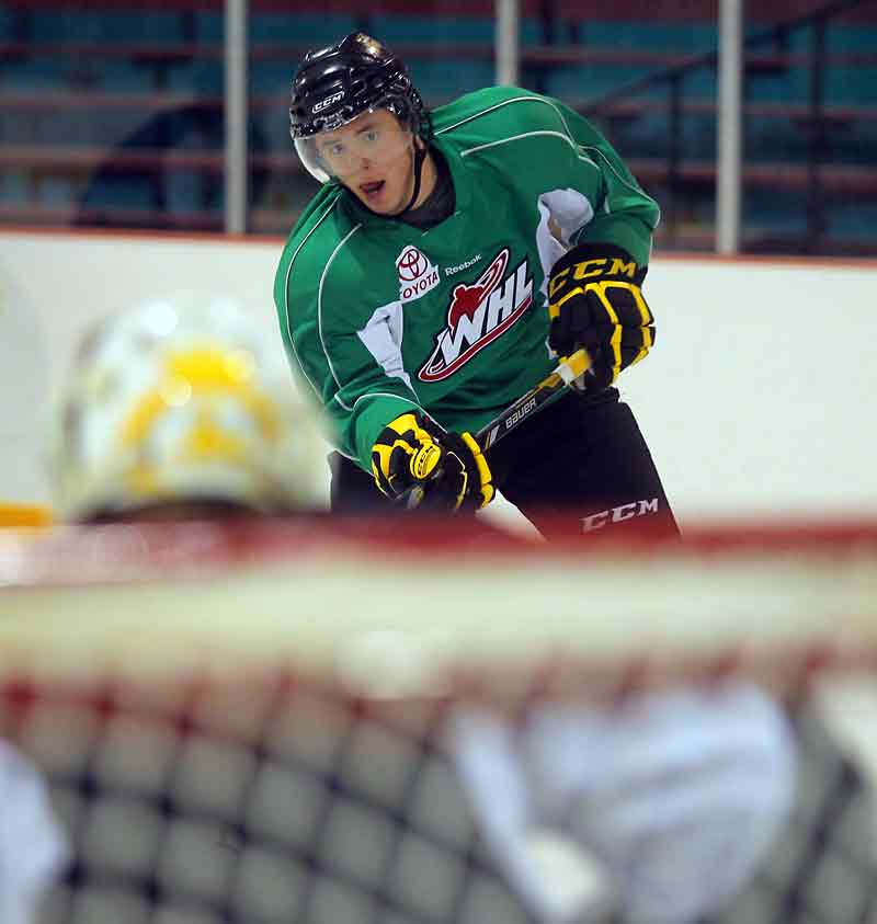 Bruce Bumstead/Brandon Sun Rookie Jayce Hawryluk takes a shot on goal in Brandon Wheat Kings practice Tuesday at the Kinsmen Arena.