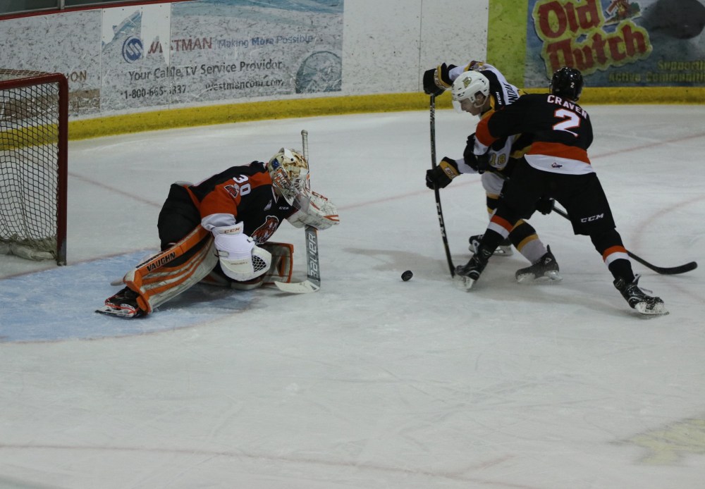 The Tigers came close to getting on the board during back-to-back power plays in the second period. The puck trickled behind Brandon goalie Dylan Myskiw and lay near the goal-line, with a Tigers forward trying to push it in.