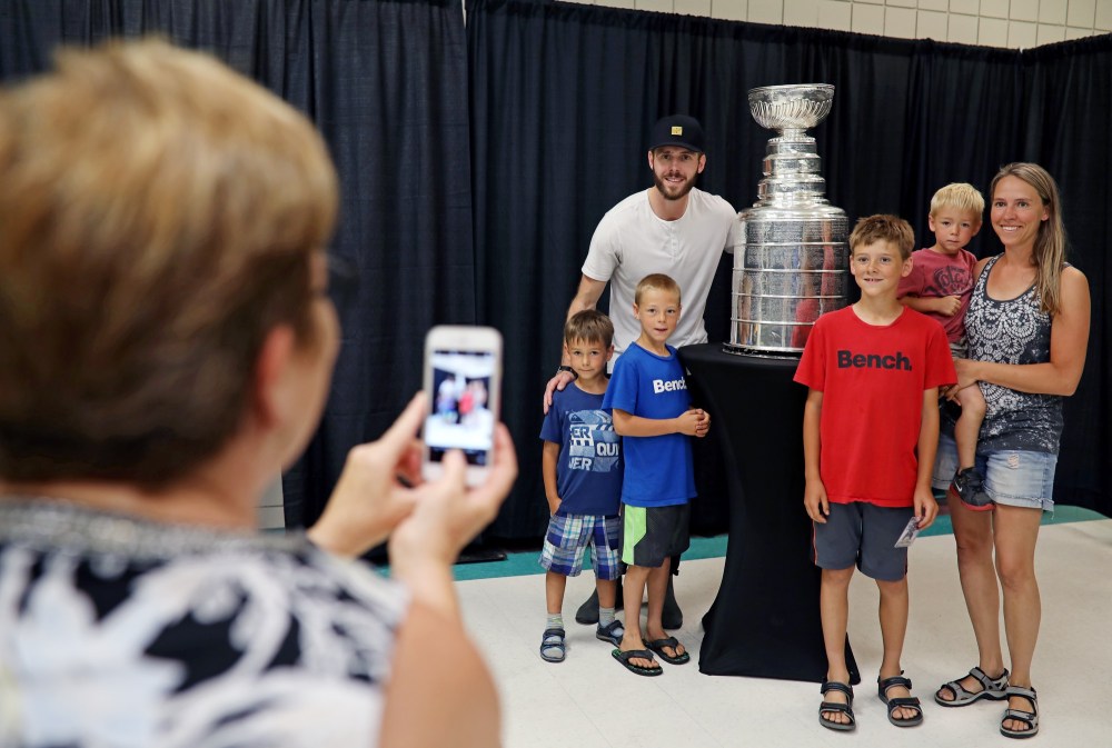 The St. Louis Blues defenceman had his day with the Stanley Cup and took it to the Keystone Centre’s UCT Pavilion, where he posed for pictures with sports’ most hallowed prize from 1 to 5 p.m. Some fans spent more than two hours in line for the chance to snap a quick picture with Edmundson and the National Hockey League’s championship trophy.