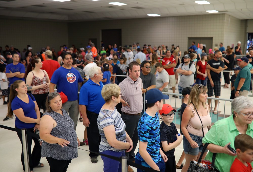 People entered to see Edmundson and the Cup on the east side of the Keystone Centre through the exterior doors of the Manitoba Room, where a long line snaked around the giant space and into the UCT Pavilion. After signing in, people were ushered into a curtained-off area for a quick photo with Edmundson and the Cup.