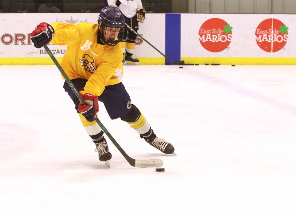 Perry Bergson/The Brandon Sun Dominic Grieco shows off his speed during a drill at Brandon Wheat Kings prospects camp last month at J&G Homes Arena.