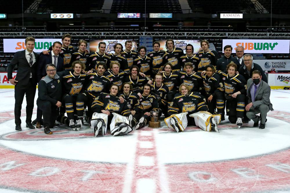 Keith Hershmiller Photography The Brandon Wheat Kings gather for a team picture after being presented with the East Division trophy in the Western Hockey League’s Regina hub on April 28, 2020.