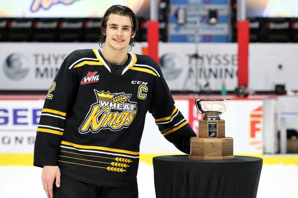 Brandon Wheat Kings captain Braden Schneider poses with the East Division’s Subway Cup trophy, which was presented following his Western Hockey League team’s 5-2 loss to the Saskatoon Blades on Wednesday at the Brandt Centre in Regina. (Keith Hershmiller Photography)