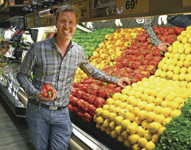 Canadian celebrity chef Ricardo Larrivee bounds between tables of stacked vegetables at a Calgary Safeway store, as he points to a spot in the cooler.