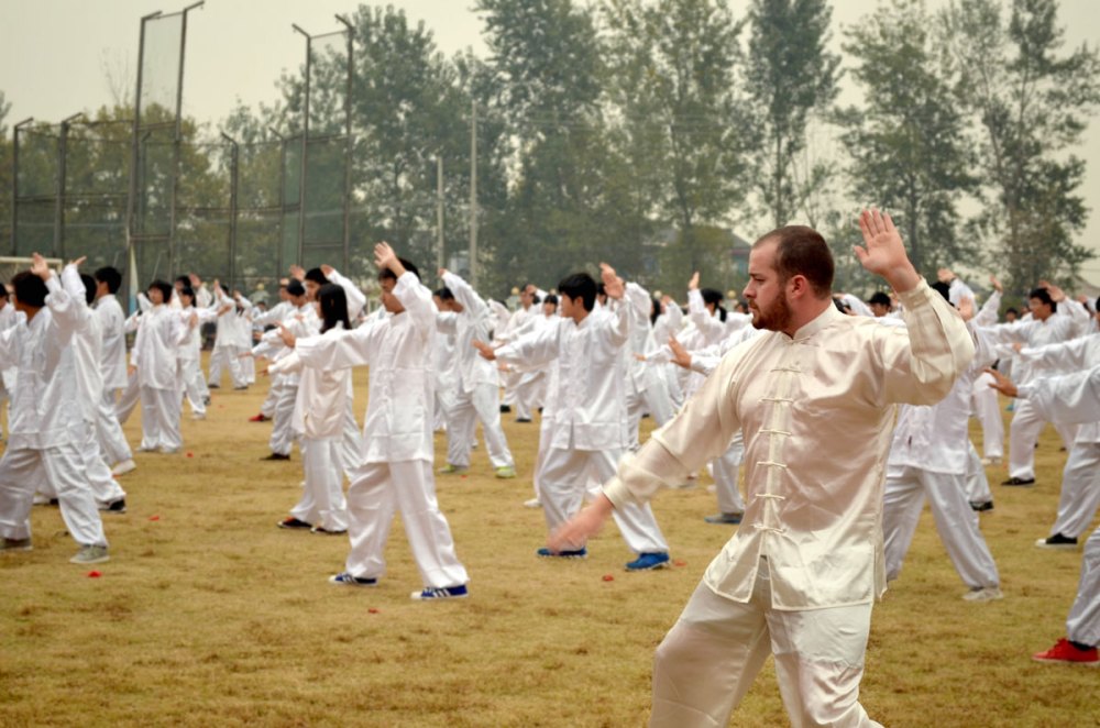 It is rare to find foreigners in China and rarer still to have them study at Taiji. Master Chuck decided to use this novelty to the school’s advantage while at the same time rewarding us. We were asked to perform the second combination of moves in front of the entire school at the annual track and field day. We were reluctant but they were insistent. And so, that is how me and the other guy Dave ended up leading five hundred students in a five minute demonstration.