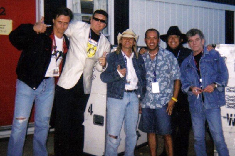 • One of the coolest memories out of all the Minnedosa festivals was getting hooked up via the KX phone lines for a last minute interview with Cheap Trick’s Rick Nielsen prior to their Saturday night headlining set back in 2001 or 2002. During our chat he actually asked me to make up their set list! Naturally I thought he was joking since he has a reputation for such behaviour; however, it turns out I was wrong. Later that evening as luck would have it, a good friend of mine spotted them out by their dressing room backstage and asked if I could set up a photo op. When I introduced myself to Rick, he said, “Hey, where’s our set list?!” They obliged for the photo and just as we were getting ready to say cheese, Dan McCafferty of Nazareth was strolling by on the way to his bus. The Tricksters called him over for the photo op and he kindly obliged. Just prior to the picture being snapped (above), I remember Rick attempting to get me in a head lock.