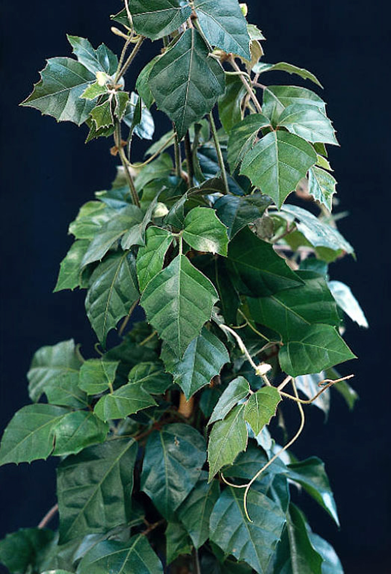 The leaves of grape ivy are dark green and although new leaves are a bit fuzzy, giving them a silvery sheen, older leaves are not particularly glossy. The leaves are produced on trailing (or climbing) stems that will adhere to a trellis, so the plant can be grown as an upright specimen.