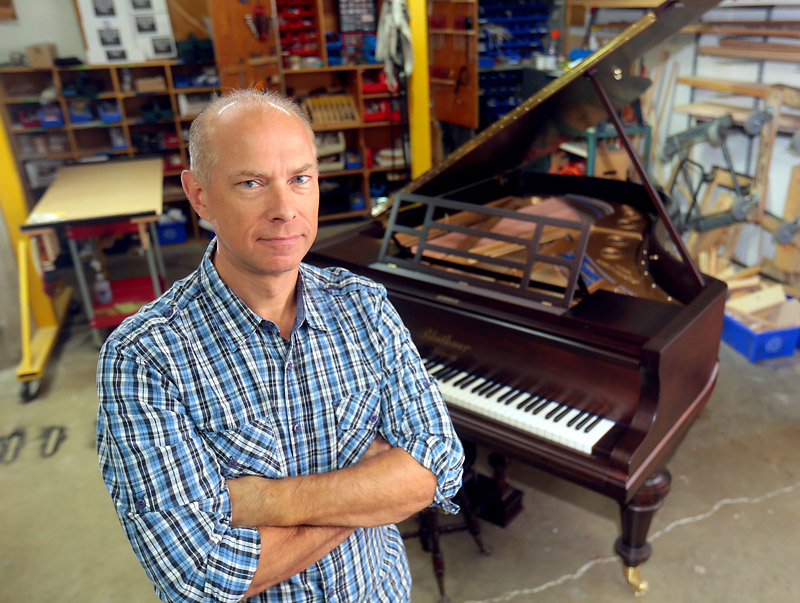Bruce Bumstead/The Brandon Sun Senior piano technician Mark Cramer recently completed a rebuild of a rare 1905 Bluthner Rosewood grand piano.