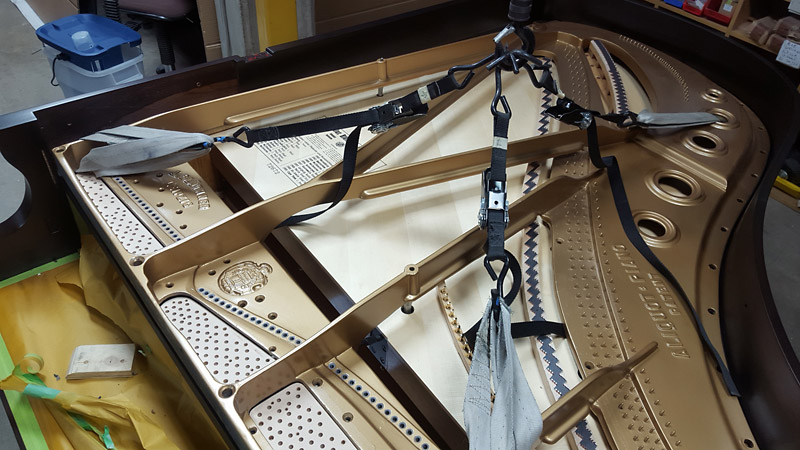 The new soundboard and strings are being installed.