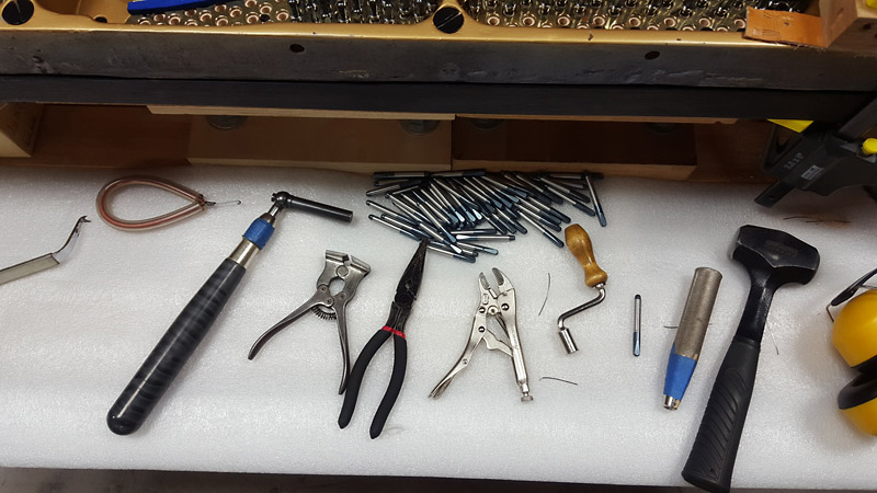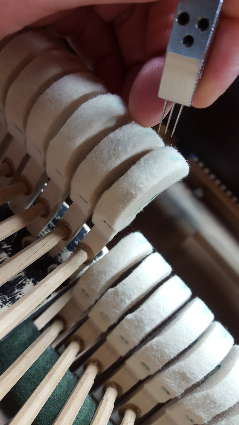 The pianos hammers, made of felt, are needled to develop the piano’s tone.