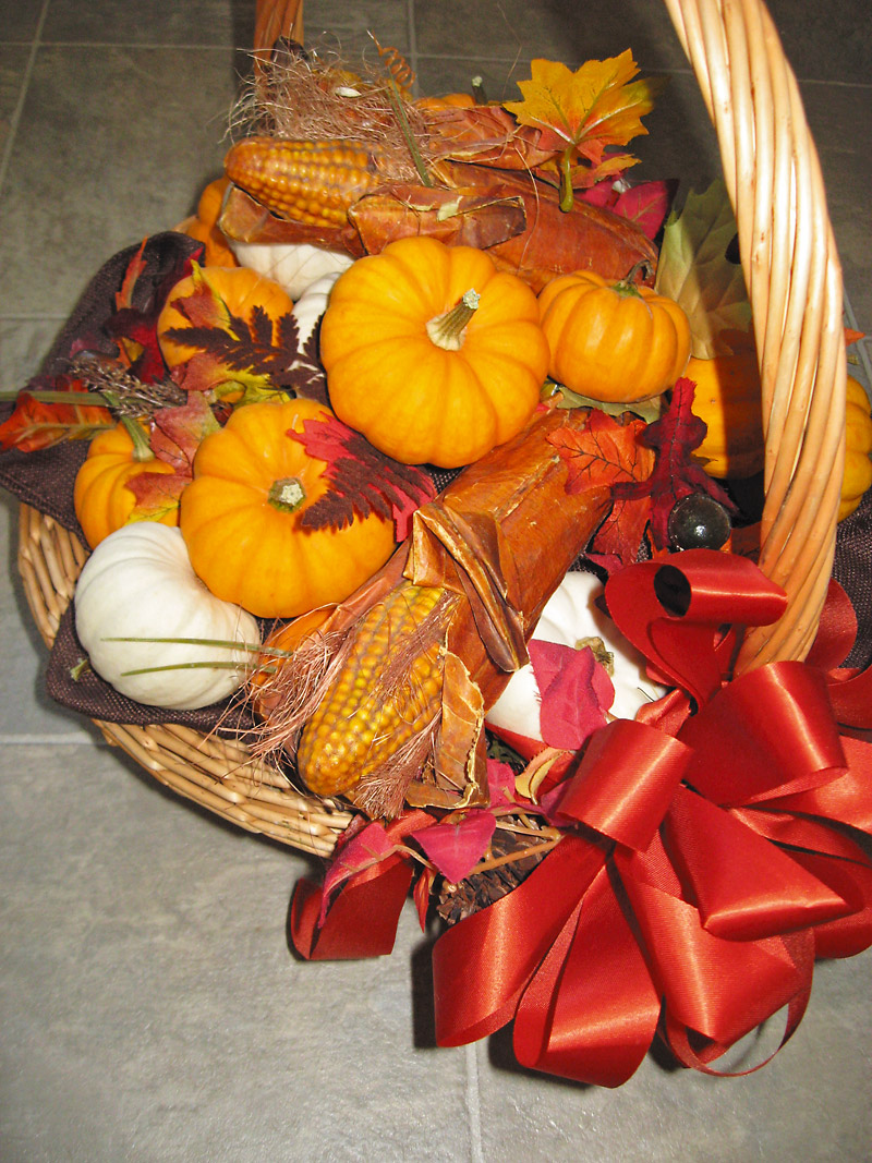 Some baskets were finished off with a big bow made from wide ribbon in autumn colours, while raffia, colourful artificial autumn leaves and potpourri were used as filler in some baskets to add colour and to fill in gaps between the corn cobs and mini-pumpkins.