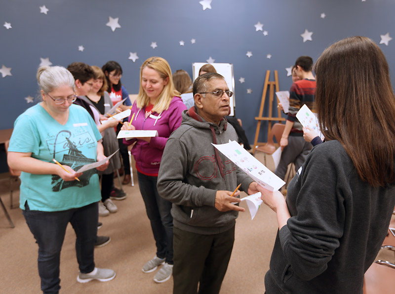 There are no assignments or instructor spouting knowledge from the front of the class. They learn through activities. They played a form of Bingo where they match life experiences, like whether they’ve tasted a Tim Hortons’ double-double, instead of numbers.
