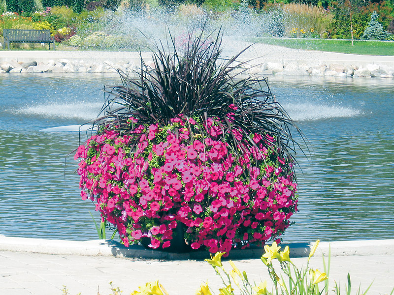 Often the newer petunias have been developed with containers in mind. They have a cascading growth habit and form huge balls of colour when planted in large hanging baskets. These are the petunias used by towns and cities to create the large balls of bloom seen hanging from light standards along the streets of many communities in the summertime.