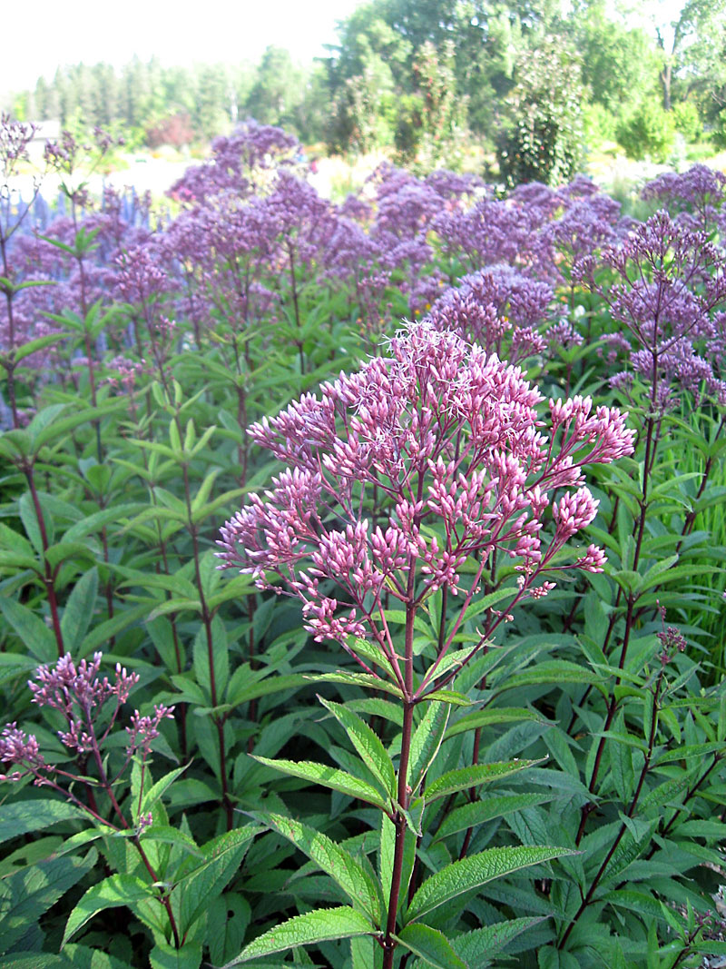 Joe Pye weed has many uses in the landscape. Because of its height it adds a vertical dimension to any border. In a large public garden or on an expansive rural property it can be mass planted, which creates a stunning effect. Its height and substantial size also make it a good plant to use as a screen or a summer hedge to hide less attractive views.