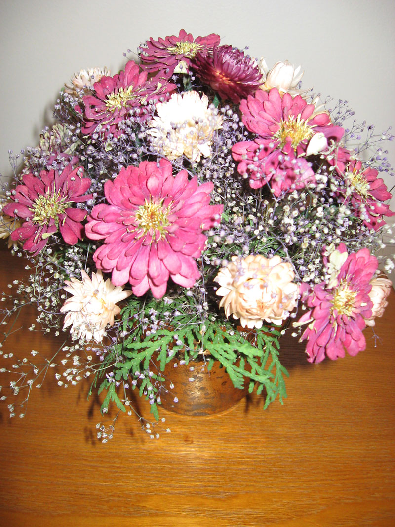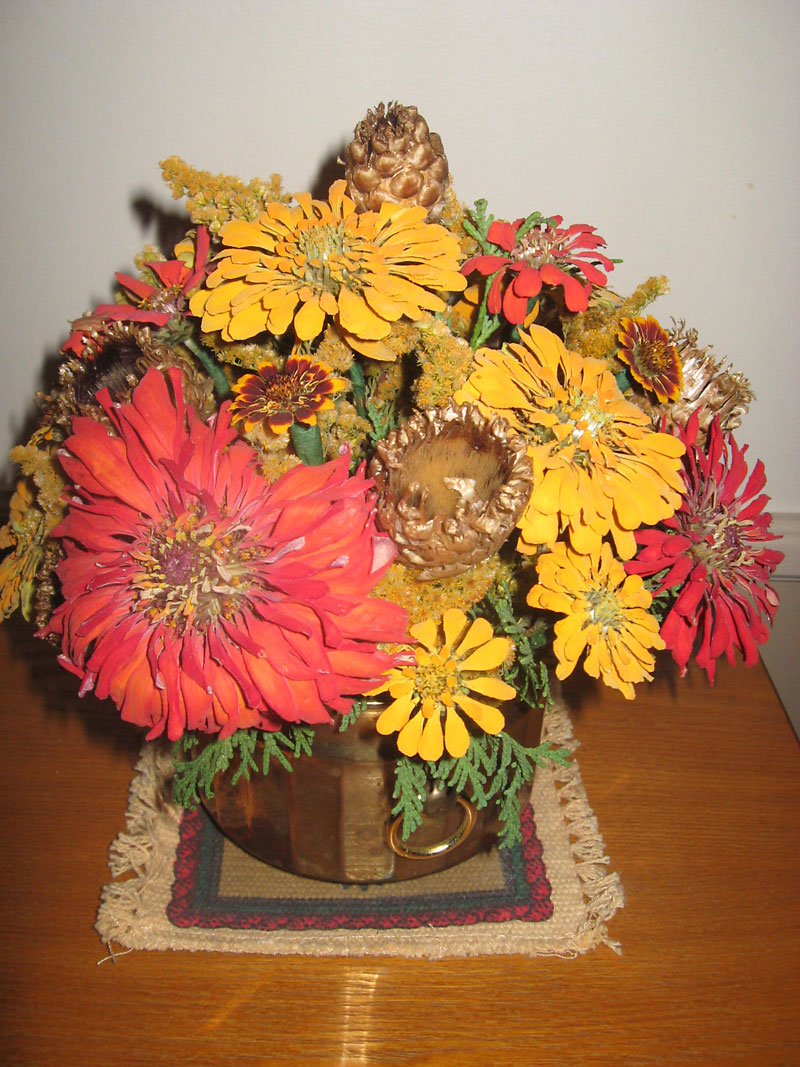 Dried autumn arrangements look best in brass, basket or brown ceramic or plastic containers. I tend to dry zinnias in the red, orange and yellow colour range as the pinks just don’t seem to say “autumn” in the same way.