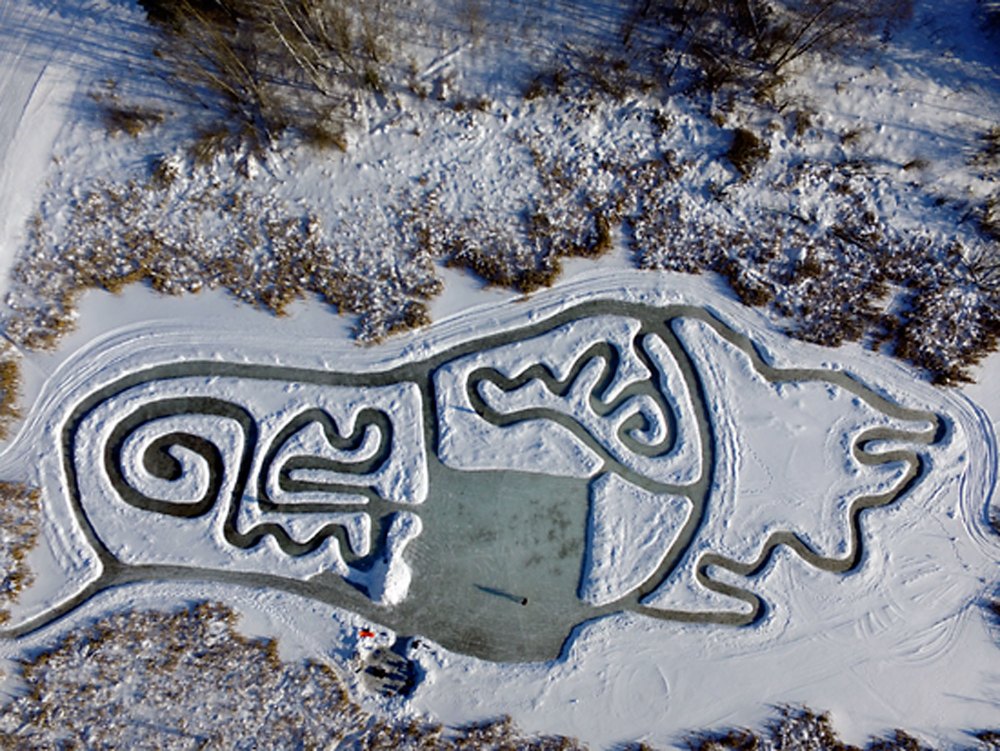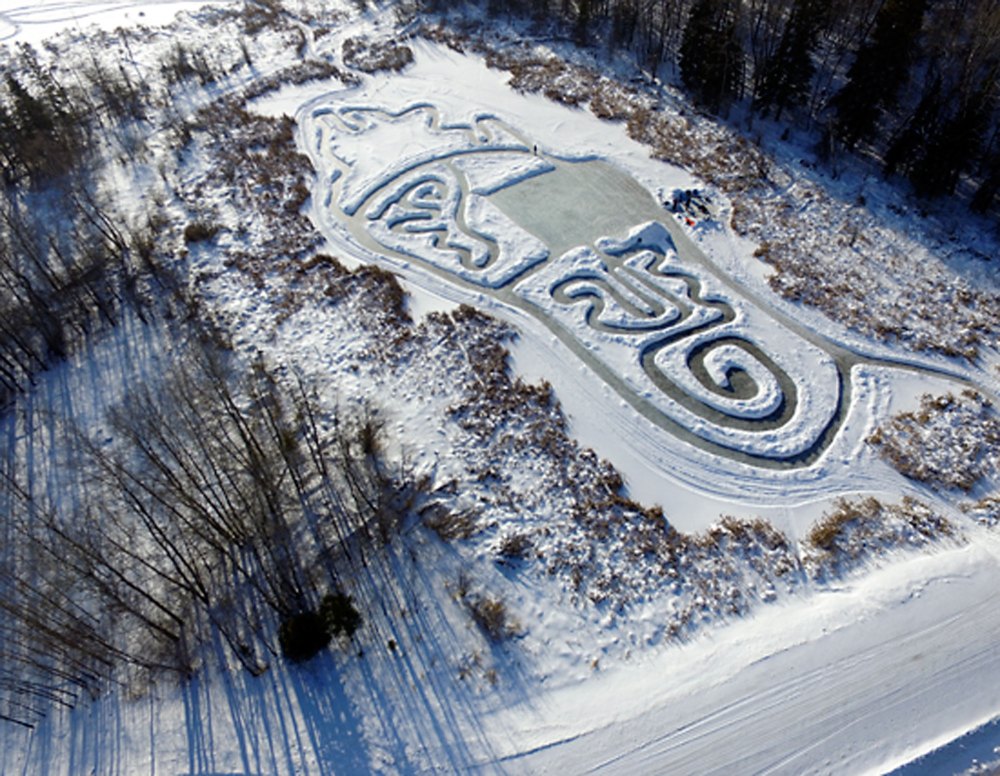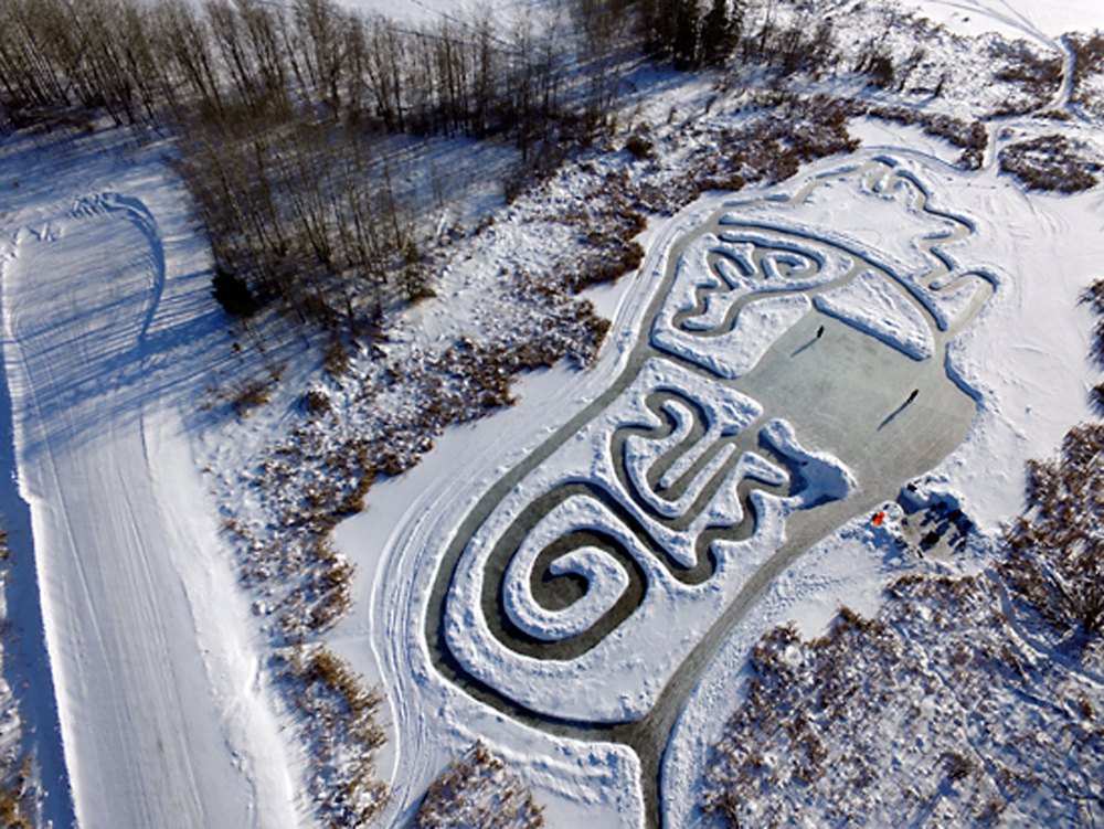 The intricate design was created at random, with a mini hockey rink and large bonfire area located on the west side. A quinzee snow shelter can also be found at the lake.