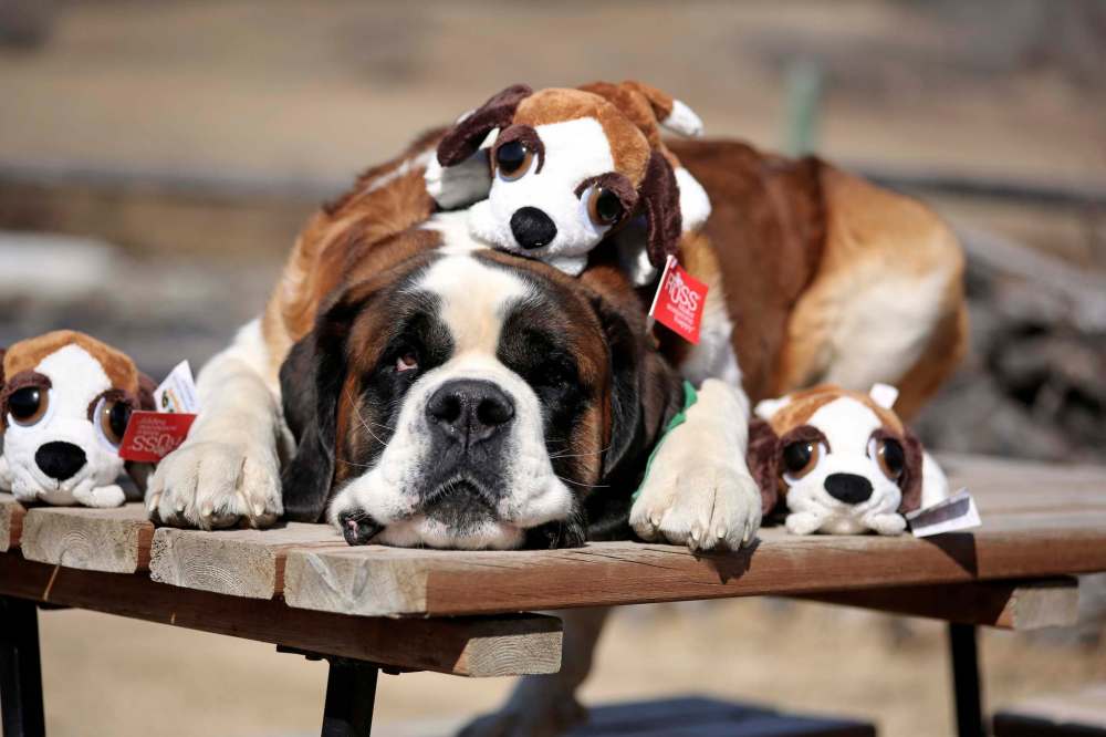 Stuffed St. Bernards are shown piled on and around Grizzly, a therapy dog. The stuffed animals are currently being given away to kids in Westman hospitals. (File)