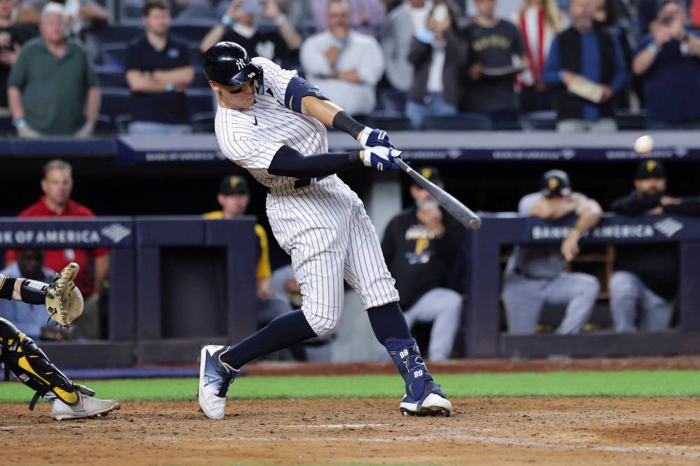 New York Yankees outfielder Aaron Judge hits his 60th home run of the season during the ninth inning of a game against the Pittsburgh Pirates in New York on Sept. 20. (The Associated Press)