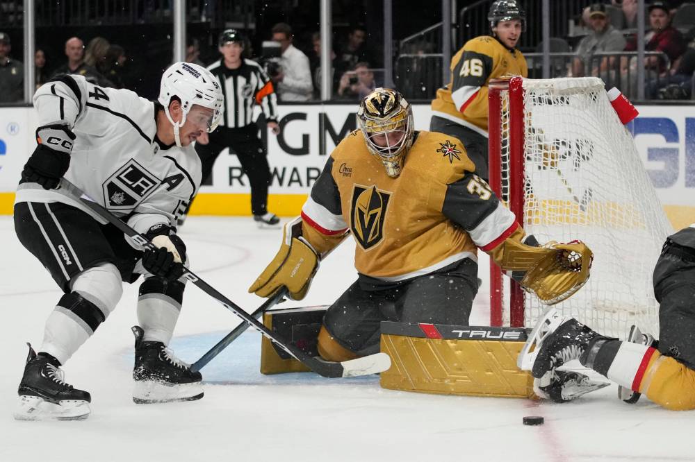 Vegas Golden Knights goaltender Adin Hill (33) blocks a shot during the third period of an NHL hockey preseason game against the the Los Angeles Kings in Las Vegas on Sept. 27. Hill was the only Canadian-born player to finish among the top 15 goaltenders in the league last season. (The Associated Press)
