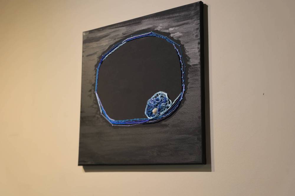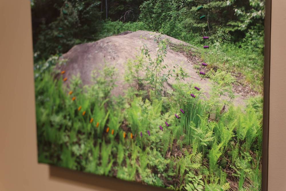 Three of the included works were of photography but Janvier pushed those photos into three dimension using beadwork overtop of the photos. The theme of weight was carried through the exhibit, every piece utilizing a rock or stone to visualize that theme.