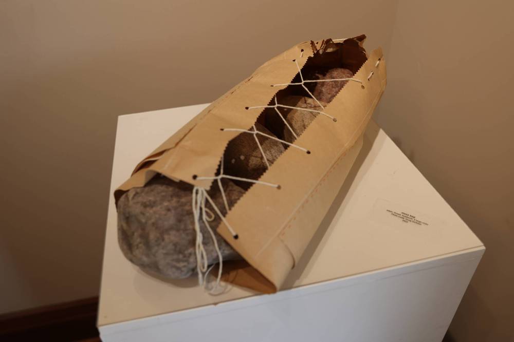 In the corner beside “healing dress” is “moss bag.” The work consists of a beaded paper bag tied around four stones.