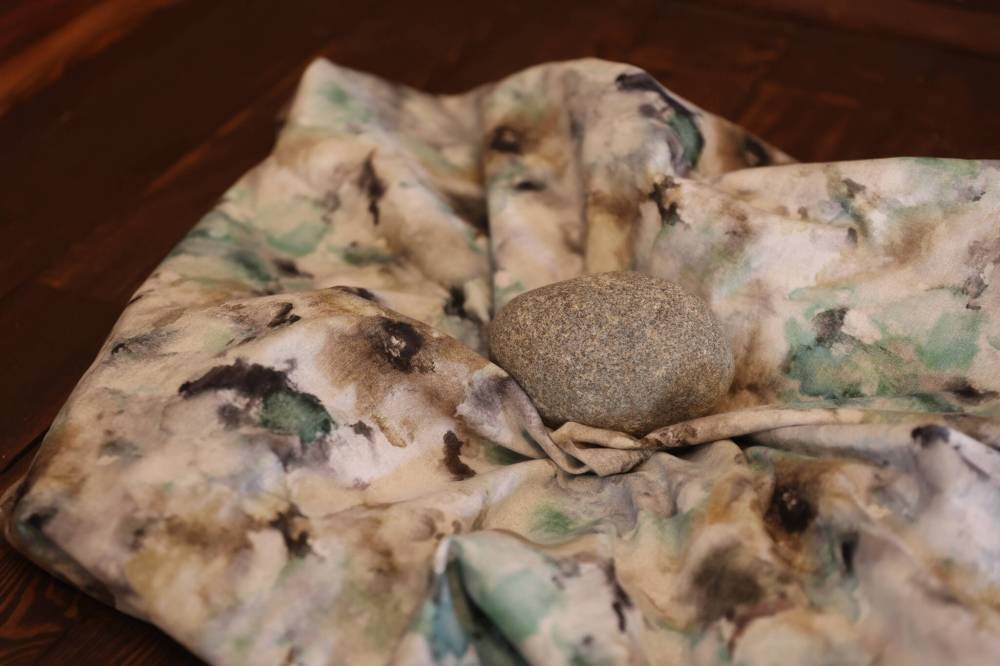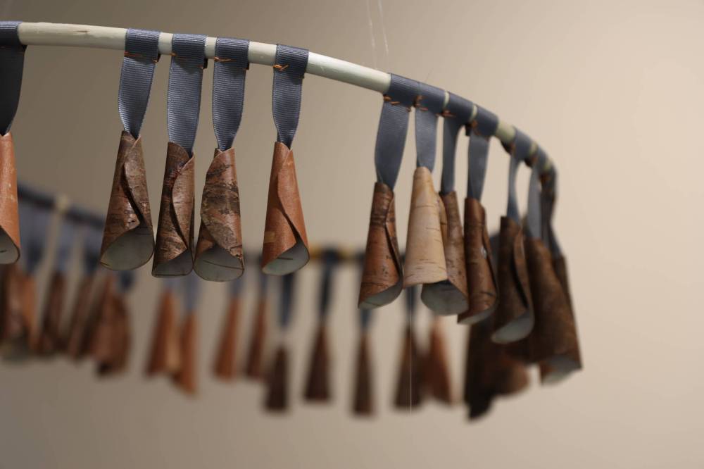 One of the works, called “healing dress,” is a hanging willow hoop with cones of birch bark hanging from it. Sitting below the hoops is a dyed cloth with a rock on top of it.