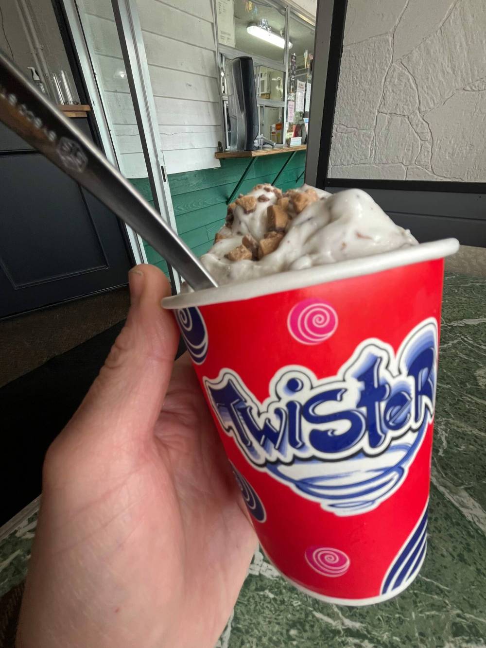 But it’s the ice cream I’m looking forward to, and so I ask for whatever cold treat tends to be the most ordered — the local favourite. To my surprise, it’s a Skor bar twister — thick soft-serve vanilla ice cream mixed with crumbled Skor bar bits.
