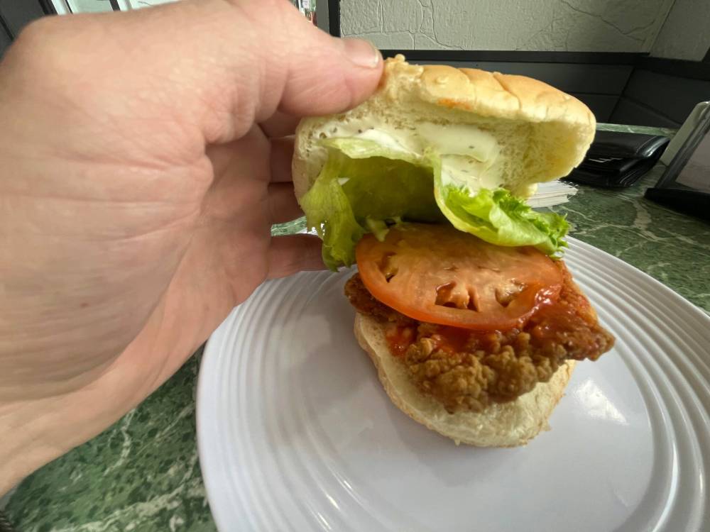 As I sip my coffee in a classic diner-style white mug, my order arrives, nice and hot. It’s a crunchy chicken filet burger with a healthy dollop of hot sauce, a tomato, lettuce and mayo on a warm bun. Simple, straight forward, and tasty.