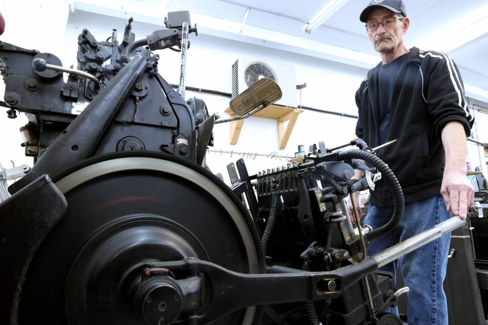 In front of a spinning, rocking machine built by Germans in the 1940s, Tweed said he’s seen things change over the years. He points to a cupboard full of wood blocks, and explains how they are used to prop up a piece on the machine so it hits paper in the right spot.