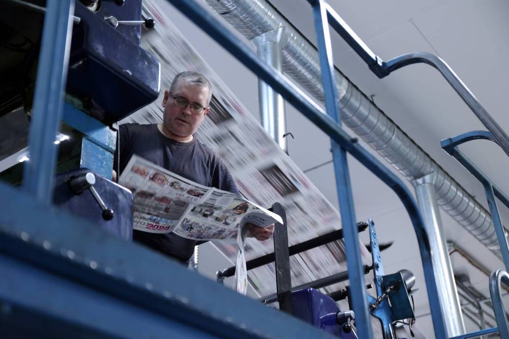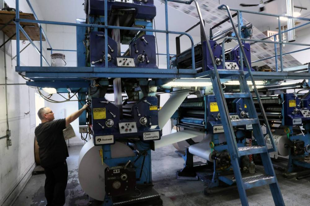 KILLARNEY – Curt Struth’s palms are covered in ink as he pushes a 900-pound roll of newspaper. Struth lifts the paper into a printing press with the help of his brother, measures a straight line across, and steps away.