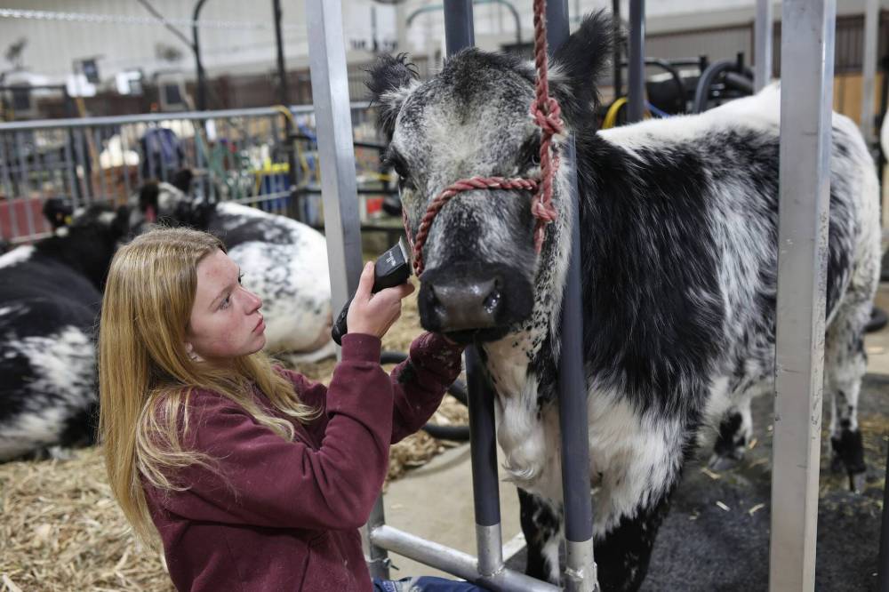 Pjs Nina 86N, a cow of the white-and-black speckle park breed, stopped in from Alberta. Less than a year old, she was brought to Brandon as she gets ready to raise money for young cattle farmers across Canada.
