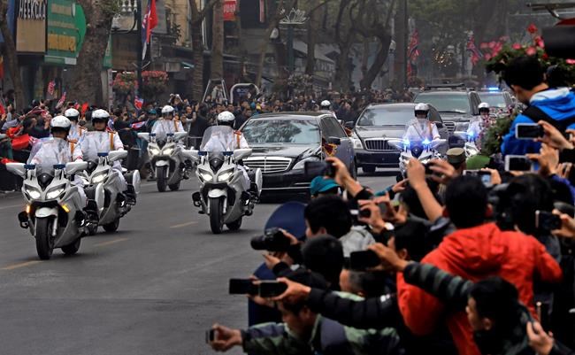 It shows Kim waving from a black limousine when it passed through a Hanoi street lined with residents waving North Korean and Vietnamese flags. The footage also shows Kim visiting the North Korean Embassy where some embassy officials and their family members skipped and wept with emotions before they took a group photo with the backdrop of a huge picture of Kim’s late father and grandfather.