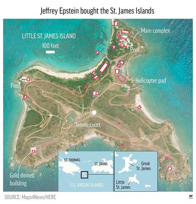 According to public records obtained by the AP, the island was once worth $3 million and owned by a woman who died in a chalet in Switzerland. The island had been divided into parcels and given to three people and was later sold to Epstein.