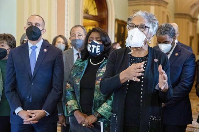 From left, Rep. Hakeem Jeffries, D-N.Y., Rep. Terri Sewell, D-Ala., and Rep. Joyce Beatty, D-Ohio, alongside other members of the Congressional Black Caucus, speak in front of the Senate chamber about their support of voting rights legislation at the Capitol in Washington, Wednesday, Jan. 19, 2022. (AP Photo/Amanda Andrade-Rhoades)