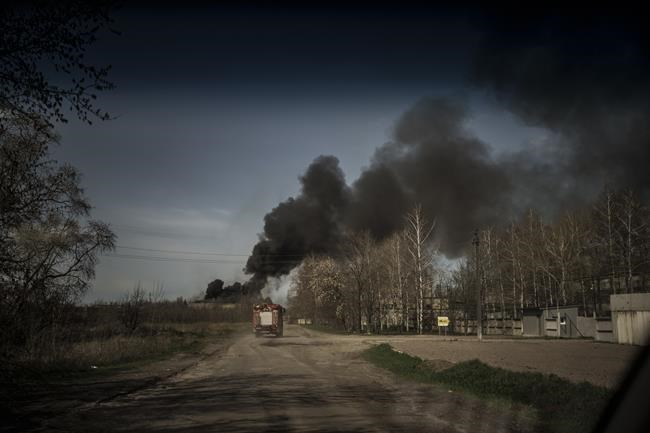 Firefighters drive towards a fire at a factory after a Russian attack in the outskirts of Kharkiv, Ukraine, Friday, April 15, 2022. (AP Photo/Felipe Dana)