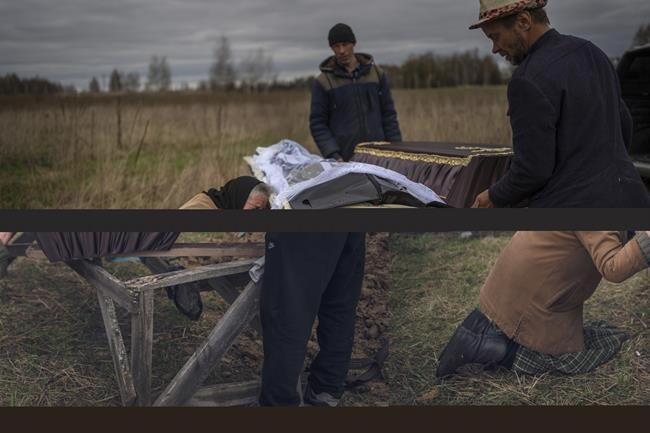 Galyna Bondar, mourns next to the grave of her son Oleksandr, 32, after burying him at the cemetery in Bucha, in the outskirts of Kyiv, Ukraine on Saturday, April 16, 2022. Oleksandr, who joined the territorial Ukrainian defence as a co-ordinator was killed by a gunshot by the Russian Army. (AP Photo/Emilio Morenatti)