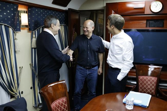 French President Emmanuel Macron, right, German Chancellor Olaf Scholz, center, and Italian Prime Minister Mario Draghi travel on board a train bound to Kyiv after departing from Poland Thursday, June 16, 2022. The Europeans leaders are expected to meet with Ukraine's President Volodymyr Zelenskyy as they prepare for a key European Union leaders' summit in Brussels next week and a June 29-30 NATO summit in Madrid.(Ludovic Marin, Pool via AP)