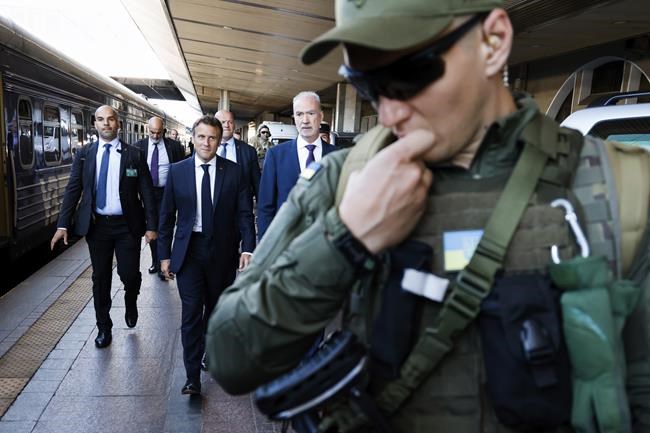 French President Emmanuel Macron, centre, is escorted as he arrives at the Kyiv train station, Thursday, June 16, 2022. French President Emmanuel Macron Prime Minister Mario Draghi and German Chancellor Olaf Scholz are expected to meet with Ukraine's President Volodymyr Zelenskyy as they prepare for a key European Union leaders' summit in Brussels next week and a June 29-30 NATO summit in Madrid.(Ludovic Marin, Pool via AP)