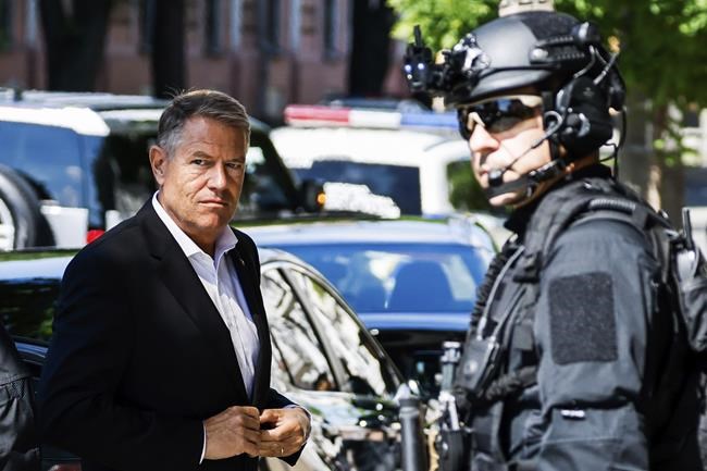 Romanian President Klaus Iohannis arrives at the hotel where French President Emmanuel Macron, Italian Prime Minister Mario Draghi and German Chancellor Olaf Scholz are staying in Kyiv, Thursday, June 16, 2022. The visit comes as EU leaders prepare to make a decision June 23-24 on Ukraine's request to become a candidate for EU membership, and ahead of an important NATO summit June 29-30 in Madrid. (Ludovic Marin, Pool via AP)