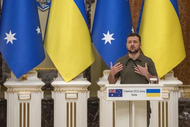 Ukrainian President Volodymyr Zelenskyy, speaks during a press conference with Australian Prime Minister Anthony Albanese, in Kyiv, Ukraine, Sunday, July 3, 2022. (AP Photo/Nariman El-Mofty)