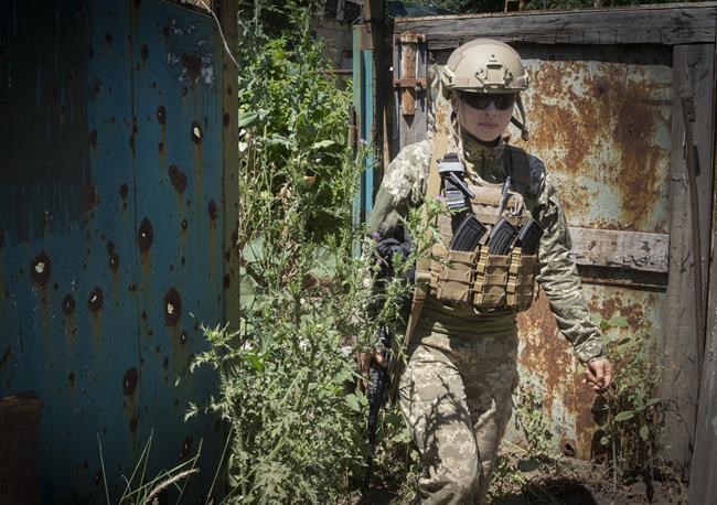Ukrainian platoon commander Mariia walks in a position in the Donetsk region, Ukraine, Saturday, July 2, 2022. Ukrainian soldiers returning from the frontlines in eastern Ukraine’s Donbas region describe life during what has turned into a grueling war of attrition as apocalyptic. Mariia, 41, said that front-line conditions may vary depending on where a unit is positioned and how well supplied they are. (AP Photo/Efrem Lukatsky)