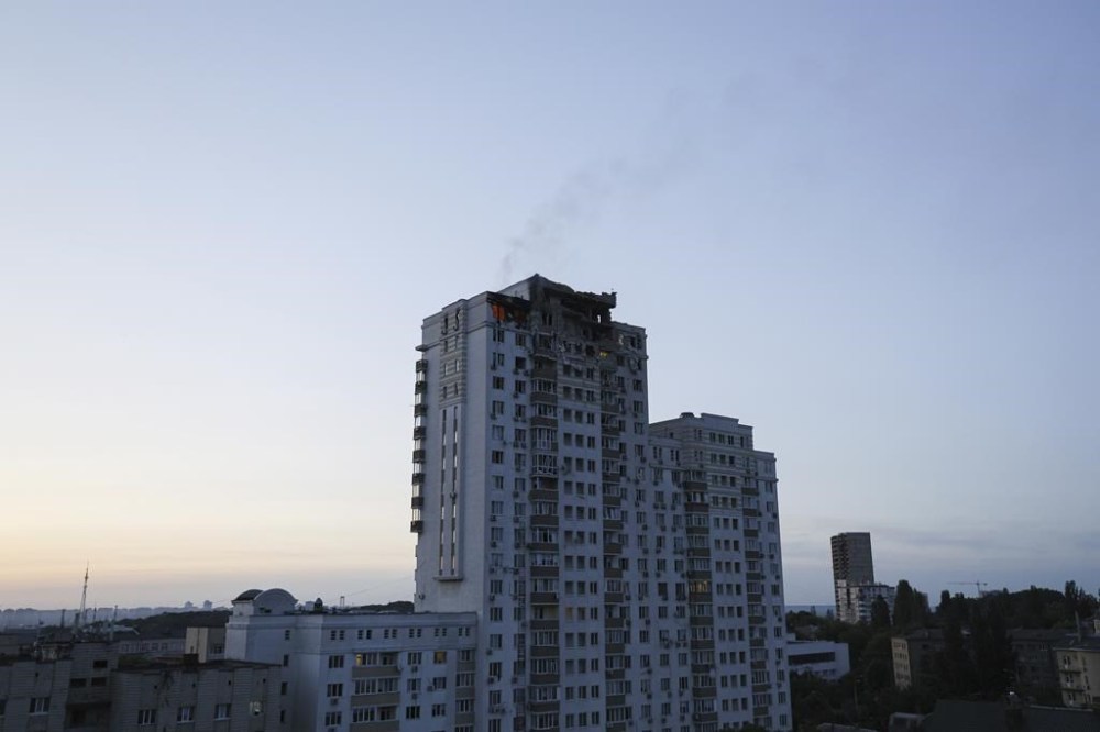 A high-rise in the same district caught fire after being hit by debris either from drones or interceptor missiles. The building’s upper two floors were destroyed, and people were feared buried in the rubble, the Kyiv Military Administration said. More than 20 people were evacuated.