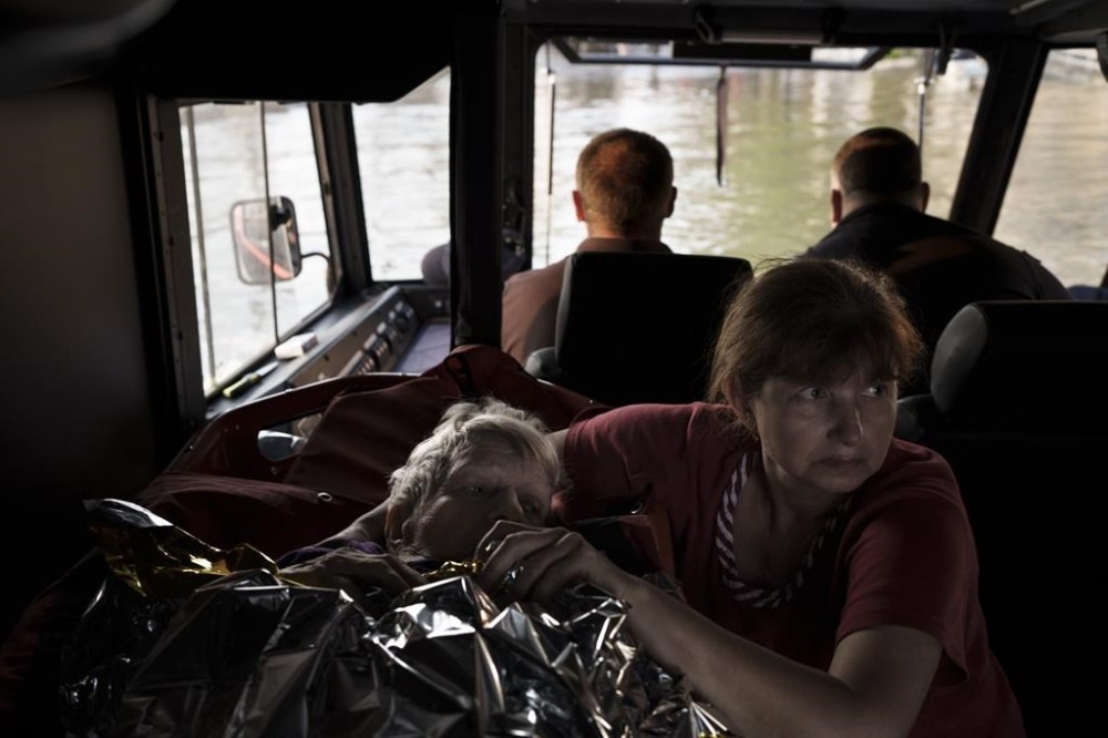 An elderly woman holds a disabled relative as they are evacuated from a flooded neighbourhood in Kherson, Ukraine, Thursday, June 8, 2023. Floodwaters from a collapsed dam kept rising in southern Ukraine on Thursday, forcing hundreds of people to flee their homes in a major emergency operation that brought a dramatic new dimension to the war with Russia, now in its 16th month. (AP Photo/Libkos)